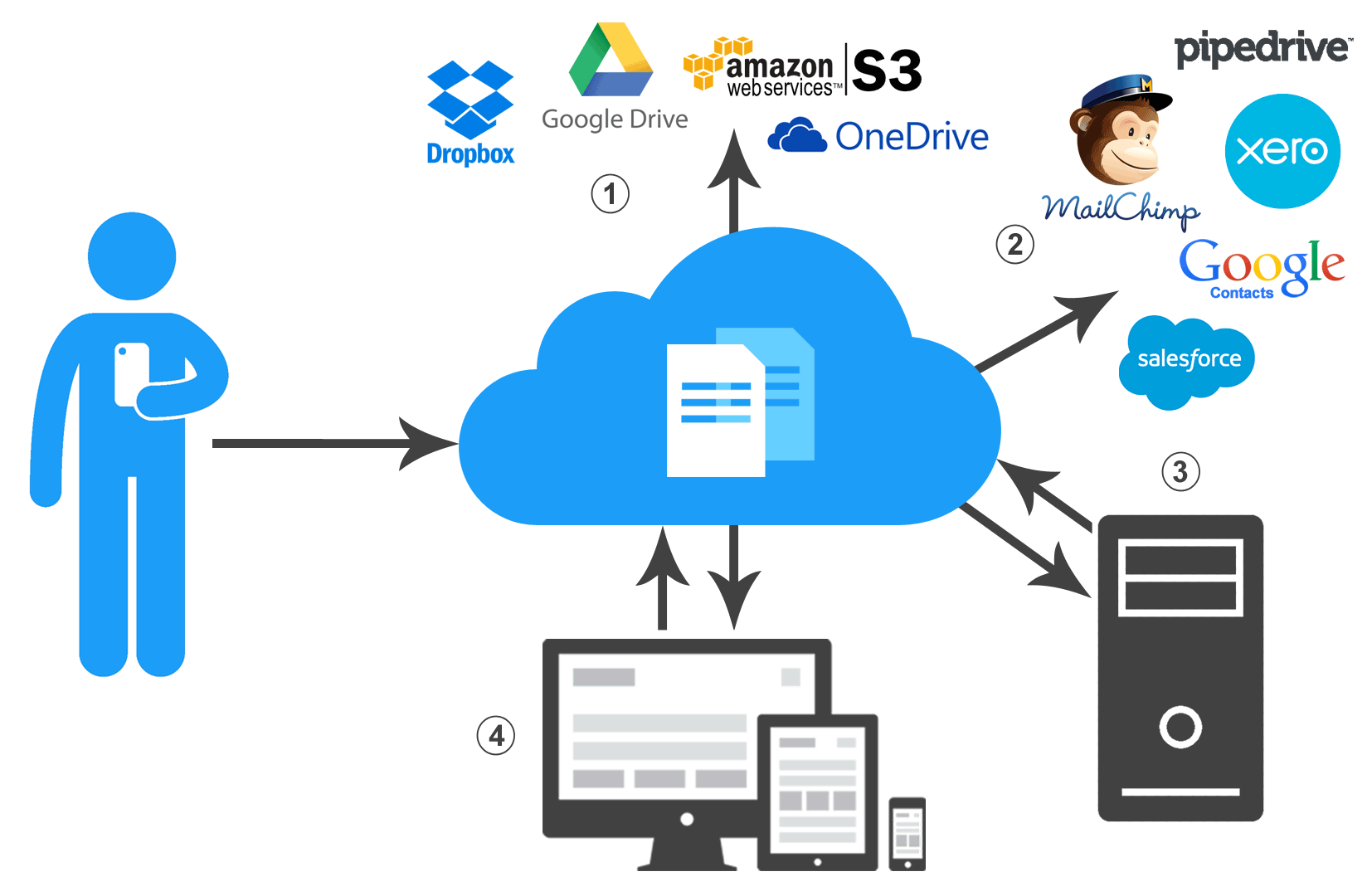 1. Push files to cloud storage    2. Push data to cloud applications    3. Pull data to an on-premise server using our API    4. Manage data using our integrated workflow